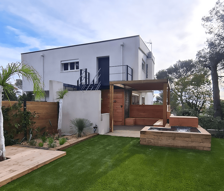 Aménagement complet de jardin | Espace Zen sur mesure. Bassin traverse bois, terrasse et pergolas en bois. Gazon synthétique. Composition de végétaux adaptés au climat sec, nécessitant peu d’arrosage. Implantation d’un olivier.